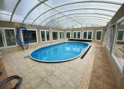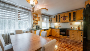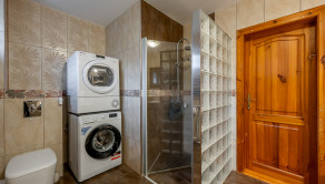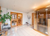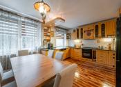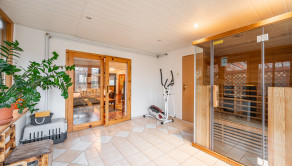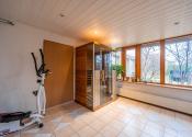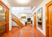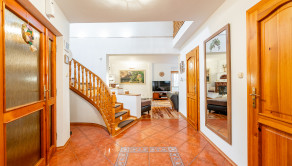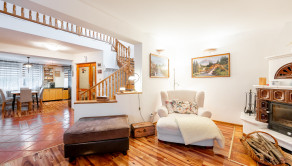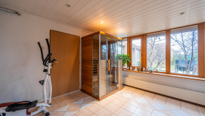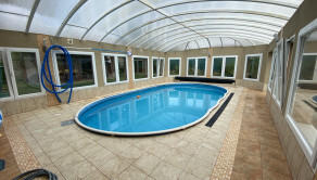 Dom má 6 spálne + veľkú svetlú obývačku s kachľovým krbom, 2 kúpeľne, kuchyňa so špajzou, veľkú dvojgaráž, zastrešený bazén, zimnú záhradu, posilňovňu atď.