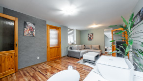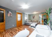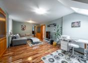 - Prízemie: Vstupná chodba, hosťovská izba, veľká kúpeľňa so sprchovacím kútom, kuchyňa prepojená s obývacou časťou.